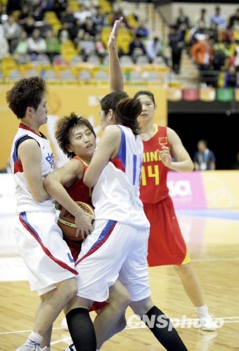 十二月十一日,东亚运女子篮球冠军争夺赛在香港体育馆举行,中国队(红衣)以83:58战胜中华台北队获得冠军。中新社发 张勤 摄