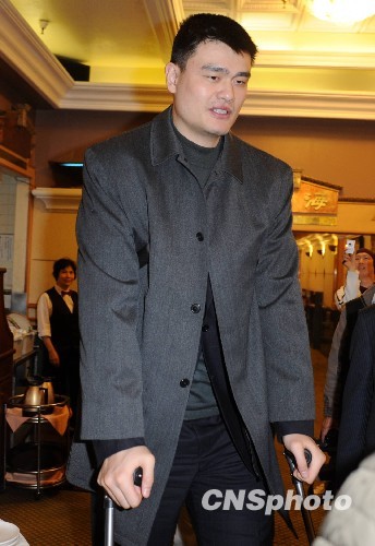 当地时间十二月三十日,NBA中国球星、上海世博会形象大使姚明手拄双拐抵达洛杉矶。脚伤未癒的姚明将参加元旦举行的美国第一百二十一届玫瑰花车大巡游。姚明将与成龙等明星共同登上上海世博会花车,向美国和全世界推介上海世博会,邀请五洲宾朋参加明年开幕的上海世博会。中新社发 张炜 摄
