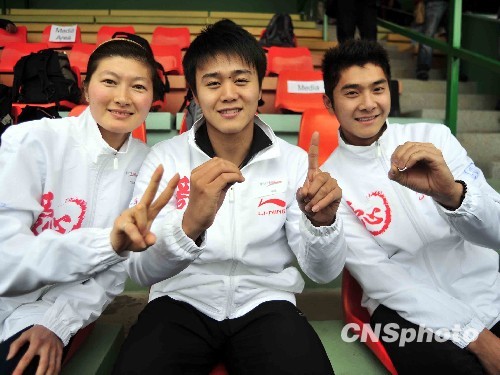 十二月三十一日,奥运长跑金牌得主邢慧娜、奥运跳水金牌得主胡佳及奥运体操金牌得主邢傲伟(左起),三十一日在香港出席“毅力十二爱心跑2009”起步礼。活动以接力跑的形式筹款,预计历时八小时,横跨今年和明年。图为三人做出2010年的手势。中新社发 谭达明 摄