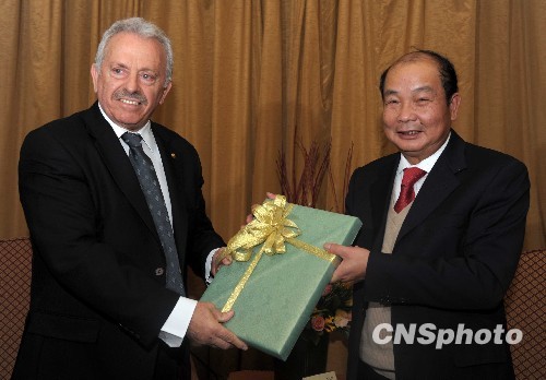 一月十一日晚,世界大运会国际技术委员会主席斯塔洛斯·多维斯一行访问深圳,先后考察深圳大运中心、健美操、自行车、医疗卫生等场馆设施。图为深圳大运会执委会副主席兼秘书长、执行局局长梁道行在五洲宾馆会见到访的斯塔洛斯·多维斯先生。中新社发 陈文 摄