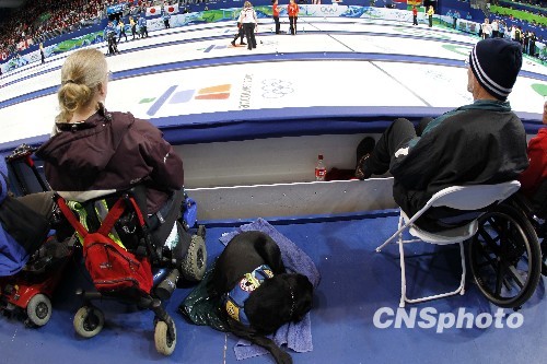当地时间2月21日,2010年温哥华冬奥会女子冰壶小组循环赛在温哥华奥林匹克中心继续进行,中国队迎战东道主加拿大队。中国队最终通过加时局以6:5险胜加拿大队。图为冰壶赛场专门在赛场边预留出无障碍席位。中新社发 盛佳鹏 摄