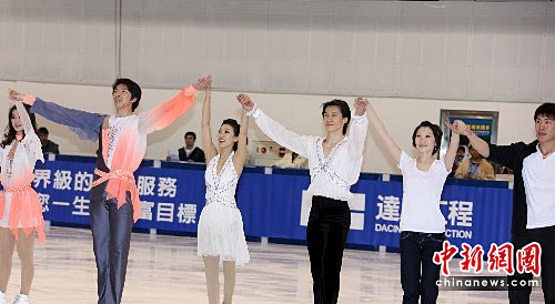 5月5日晚,大陆优秀滑冰选手在台北小巨蛋冰上乐园进行正式表演,掀起“冰风暴”。图为花样滑冰情侣拍档庞清(左3)/佟健,以及张丹(右2)/张昊等选手在精彩表演后,一齐牵手答谢近千台湾观众。