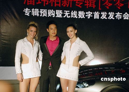 5月13日晚,嘻哈小天王潘玮柏携全新专辑《零零七》来到北京与全国媒体见面。图为发布会前,潘玮柏自驾一辆银色阿斯顿马丁跑车驶入场内,下车大摆007国际特工造型,两位性感女郎更是伴随左右,令潘玮柏酷劲十足。中新社发 李学仕 摄