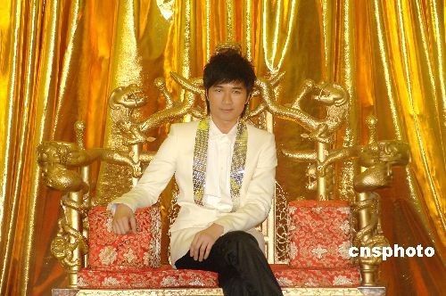 5月31日,古巨基在北京举行“登基大典”,宣布正式签约英皇。发布会上,古巨基端坐皇帝龙椅,8名武士跟随御驾,派头十足。现场还有舞狮助阵,气氛热烈。英皇娱乐表示将会把古巨基的事业推向更高,除了会继续为他推出个人音乐专辑,更准备落重本为古巨基开拍电影,助其实现自导、自演的愿望。据香港媒体报道,基仔以2000万港元天王价跳槽,签3年合约。英皇还豪掷200万港元为基仔在北京和澳门召开签约记者会。发布会上有记者问基仔是否会与谢霆锋争“一哥”,古巨基大方表示,名誉并不重要,重要的是个人要努力、有诚意。图为古巨基端坐皇帝龙椅“登基”英皇娱乐。中新社发 李学仕 摄