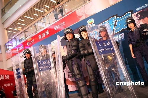 五月三十一日,香港无线电视艺员黄德斌(左起)、黄自贤、唐诗泳等穿着铁甲威龙装备出席宣传活动,配合无线电视推出的《ID精英》新剧目。中新社发 洪少葵 摄