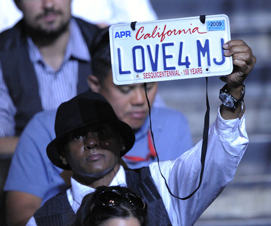 北京时间7月8日凌晨,迈克尔·杰克逊的公众追思会在美国洛杉矶的斯台普斯体育中心举行。图为歌迷举牌向过世天王示爱。