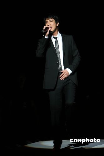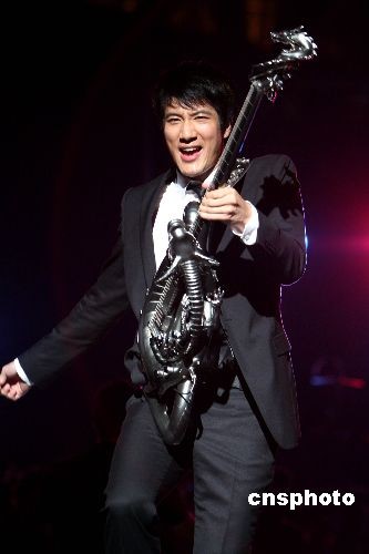 2009年7月15日晚,王力宏在北京正式成为某男装品牌的形象代言人,并手持“龙形吉他”现身,以一首热力十足的《龙的传人》将场内气氛带到了最高潮。中新社发 袁方 摄