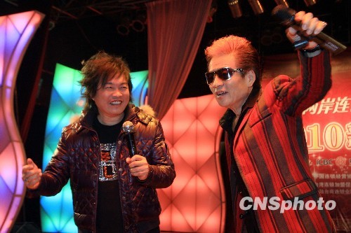 3月11日晚,台湾青蛙王子高凌风(右)和台湾著名节目主持人康康在上海向台商献歌,为台商在大陆拼搏事业加油。他们在当晚举行的海峡两岸连锁业新春团拜会上,还为4月3日在上海举行的“台湾三大男高音演唱会”(吴宗宪、高凌风、康康)做推广。中新社发 潘索菲 摄