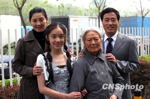 5月5日,电影《第一书记》(原名《沈浩日记》)剧组在北京拍摄重头戏。图为沈浩扮演者杨立新携“妻子”徐帆等全家成员亮相。电影预计于5月8日全部杀青,7月1日正式上映。中新社发 李学仕 摄