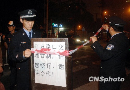 9月30日22点45分,距离天安门不远的和平门附近,民警拉起警戒线,准备实行23点开始的交通管制措施。届时,天安门地区数十条街道除持有国庆庆祝大会专用证件的车辆和人员外,禁止其他车辆和行人通行,公共汽车停止运行。 中新社发 李学仕 摄