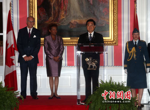 当地时间24日上午,正在这里进行国事访问的中国国家主席胡锦涛在加拿大总督府会见加拿大总督米夏埃尔·让。会见前,米夏埃尔·让夫妇为胡锦涛的到访举行了隆重的欢迎仪式。
