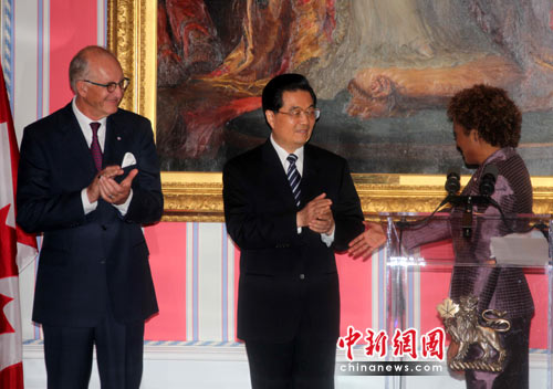 当地时间24日上午,正在这里进行国事访问的中国国家主席胡锦涛在位于渥太华的加拿大总督府会见加拿大总督米夏埃尔·让。会见前,米夏埃尔·让夫妇为胡锦涛的到访举行了隆重的欢迎仪式。