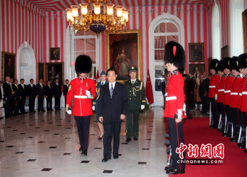 图为在仪仗队长陪同、双方卫士长随行下,胡锦涛在总督府内检阅加拿大仪仗队。记者 张朔 摄