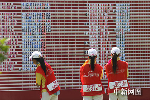 包括11名非职业球手在内的92名球员,2006年9月21日在云南昆明乡村高尔夫俱乐部挥杆开战,从而拉开2006欧米茄中国高尔夫巡回赛昆明站的战幕。图为赛场计分牌实时更新,显示最新战况。 余瑞冬 摄