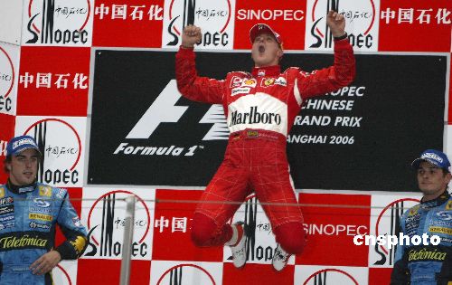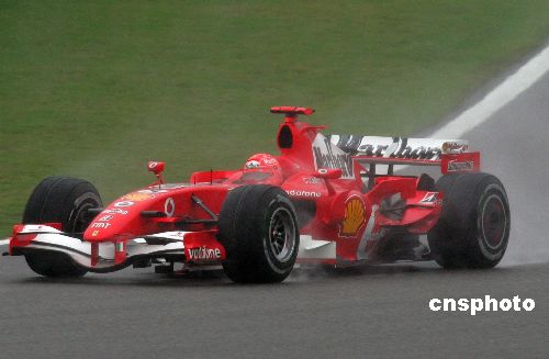 2006F1上海站决赛10月1日在雨中激战,“车王”舒马赫(Michael Schumacher)不断超越对手神勇夺冠。中新社发 任晨鸣 摄