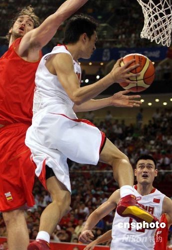 北京奥运会男子篮球小组赛第二轮赛事8月12日开始,首战负于“梦八队”的中国男篮在姚明率领下向世锦赛冠军西班牙队发起猛攻,在一路领先的大好局面下被西班牙队在终场时扳平,经过加时赛以75比85告负。中新社发 任晨鸣 摄