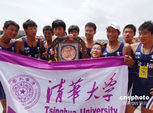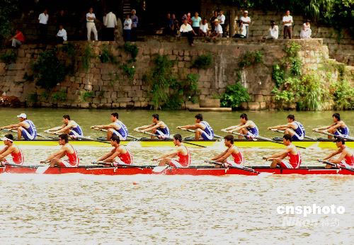 9月1日,2008海峡两岸高校赛艇龙岩邀请赛在福建省龙岩上杭水上运动中心举行。来自北京大学、清华大学、台湾辅仁大学、香港中文大学赛艇队,参加男子八人单桨有舵手赛艇竞赛项目角逐。经过激烈争夺,清华大学、北京大学、台湾辅仁大学、香港中文大学赛艇队分获前四名。中新社发 刘可耕 摄