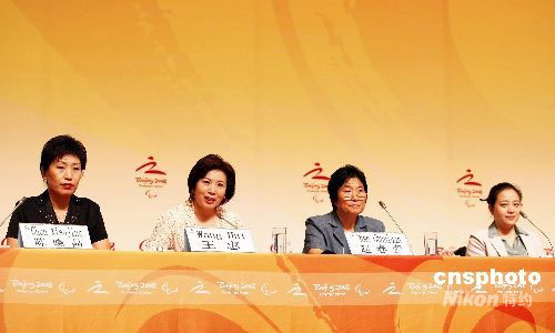 9月3日,北京残奥会主新闻中心举行“北京市残疾人事业发展及温馨家园建设成就情况”新闻发布会。北京市残疾人联合会理事长赵春鸾(右二)在发布会上介绍,政府各个部门都研究了温馨家园如何投入的问题。基本上政府为主导,从公共服务里、残疾人事业当中投入一部分,第二部分是社会责任,还有一块是社会的捐赠。中新社发 盛佳鹏 摄