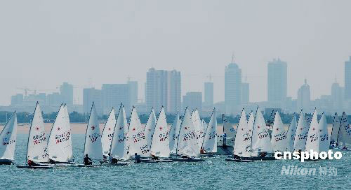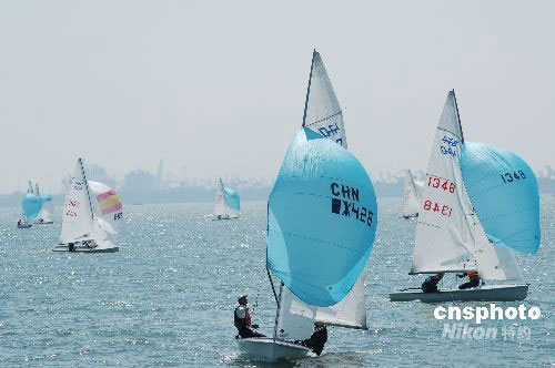 2008年9月5日,参加2008年中国帆船帆板锦标赛的船只在山东省日照市万平口海域开始比赛。当天,2008年中国帆船帆板锦标赛拉开帷幕,比赛分为帆船比赛和帆板比赛,分别有15支和17支代表队进行角逐,两个项目的比赛又分别设5个比赛项目,比赛将于9月10结束。中新社发 贾艳锋 摄