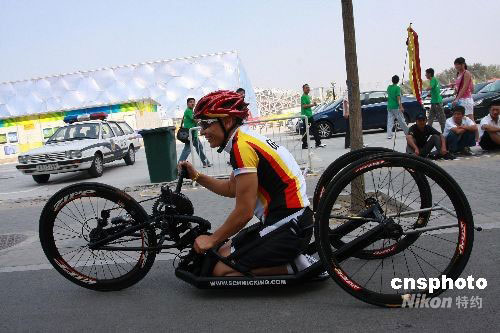 9月5日,北京残奥盛会即将开幕,一名自行车运动员正在奥运村周边加紧训练备战残奥,吸引不少游客关注。中新社发 郑雄增 摄