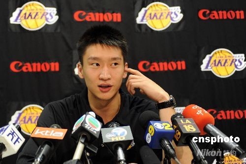 9月24日下午,美国NBA洛杉机湖人队在自己的训练基地举行记者会,正式向媒体记者介绍刚刚加盟的中国球员孙悦。孙悦在记者会上用流利的英语回答记者提问。孙悦说,他对自己在湖人队的位置很清醒,自己会加倍努力,尽量多争取上场时间。图为孙悦向记者解释外号“Q”的来历。中新社发 张炜 摄
