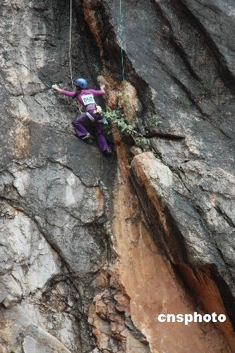 首届中国山地运动会十四日在贵州兴义圆满落幕, 在为期五天的比赛中,共产生攀岩、拓展、负重登山、山地多项四大项十八小项的五十四枚奖牌。图为来自重庆中体队女运动员李春华挑战四十米高大岩壁。中新社发 马逢萃 摄