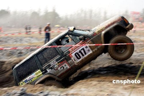 10月17日,2008华东地区汽车场地越野邀请赛决赛在安徽淮北市举行。比赛分为男子、女子两个组别,赛场设计了包括炮弹坑、深水池、跷跷板、沼泽地等18个障碍,来自华东地区百余顶尖车手、近60辆赛车齐聚淮北,各施绝技。中新社发 万善朝 摄