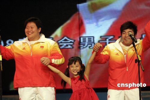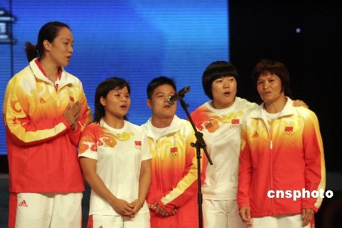 10月21日晚,赢得北京奥运会拳击、跆拳道、举重、柔道、摔跤等项目的奥运冠军,包括张小平、邹市明、陆永、陈燮霞、刘春红、曹磊、王娇、吴静钰、冼东妹、佟文、龙清泉、张湘祥、廖辉及前奥运会女子跆拳道冠军陈中等14位奥运冠军,参加“三亚城市精神评选暨奥运冠军三亚行活动”晚会,为观众演唱歌曲《真心英雄》。中新社发 尹恩彪 摄