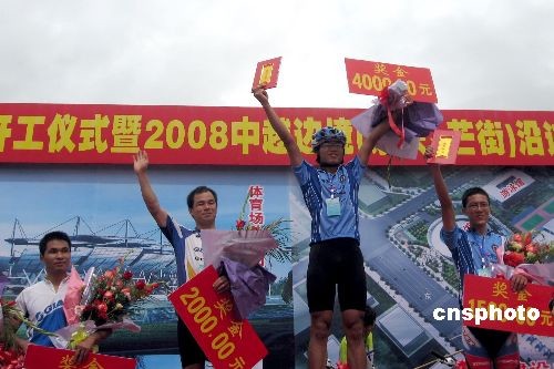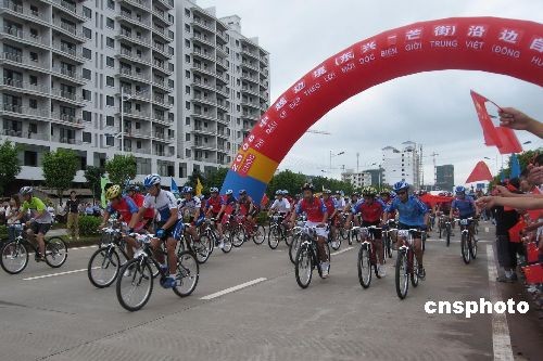 11月2日,首届中越边境(东兴—芒街)沿边自行车邀请赛在广西东兴沿边公路举行。此次邀请赛共有77名参赛选手,其中越南籍选手18人。今次比赛从广西东兴市体育馆出发,途经晚清和越南法国殖民当局划界所立的“一号界碑”,全程25公里。中新社发 袁莺 摄