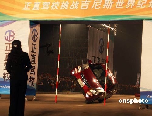 11月2日晚,在山东临沂正直驾校内,中央电视台正大综艺栏目组及吉尼斯总部工作人员一起见证了一项新的吉尼斯世界纪录的诞生——正直驾校特技队以两轮行驶,穿越车身立起高度加上66厘米的限宽门,刷新了一项新的世界纪录(上次世界纪录是车身高加67厘米的宽度)。央视节目主持人朱迅现场主持。中新社发 朱桂文 摄