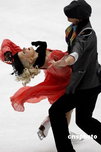 11月7日,2008中国杯世界花样滑冰大奖赛在北京首都体育馆进行第二天的争夺,俄罗斯组合多姆尼娜、沙巴林在冰舞创编舞比赛后,以95.58的成绩继续排在参赛的十对选手之首。中新社发 盛佳鹏 摄