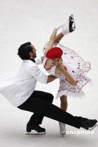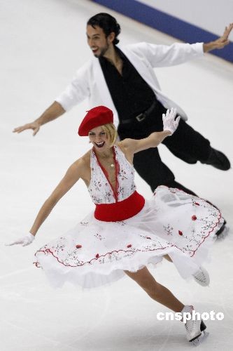11月7日,2008中国杯世界花样滑冰大奖赛在北京首都体育馆进行第二天的争夺,美国组合贝尔宾、阿冈斯托在冰舞创编舞比赛中获第一名,并以95.23分的总成绩位列十对参赛选手的第二名,俄罗斯组合多姆尼娜、沙巴林以95.58的成绩排在参赛的十对选手之首。中新社发 盛佳鹏 摄