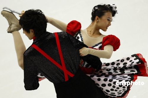11月7日,2008中国杯世界花样滑冰大奖赛在北京首都体育馆进行第二天的争夺,在冰舞创编舞的比赛中,中国三对选手表现一般,分列十对参赛选手的第八至第十位。图为中国选手郭贾美美、孟飞在比赛中。中新社发 盛佳鹏 摄
