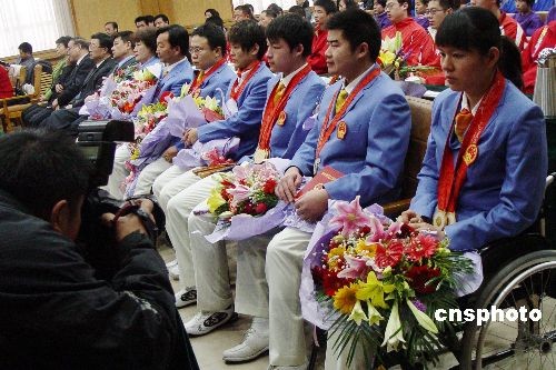 十二月二日,河南省举行第十三届残奥会庆功表彰大会,许庆、任桂香、范蕾、李满洲四位残奥会冠军被授予“河南省劳动模范”称号及“河南省五一劳动奖章”、“五四青年奖章”等。在本届残奥会上,河南省运动员许庆、任桂香、范蕾、李满洲等六人参加乒乓球、游泳、射击等三个大项十四个小项的比赛,取得七金、两银、一铜、两个第四、两个第五的成绩,并四破三项世界记录。中新社发 李志全 摄