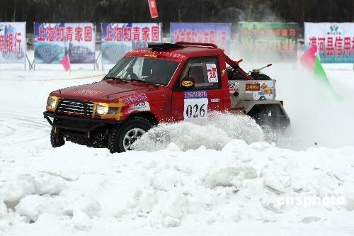 3月9日,中国漠河国际冰雪汽车越野赛暨2009全国汽车越野系列赛漠河站比赛在北极漠河拉开战幕。“金马杯”第六届中国漠河国际冰雪汽车越野赛暨2009全国汽车越野系列赛漠河站比赛的前身为“中国北极漠河•黑龙江源头冰雪汽车挑战赛”,此项赛事始办于2004年,是在自然冰雪江河上举行的冰雪赛事,迄今为止已经成功举办了五届。中新社发 夏明晶 摄