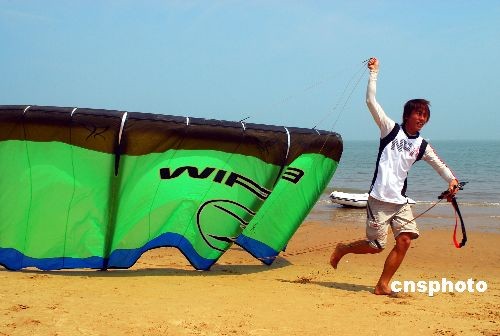3月19日,为期两天的“2009海口帆板暨风筝冲浪邀请赛”在海口市西秀海滩开幕。这是我国首次举办国际性风筝冲浪大赛。比赛设公开级风筝冲浪场地赛、风筝冲浪自由花式赛、公开级帆板场地赛和特邀组帆板场地赛等多个项目。中新社发 善平 摄