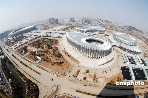 2009年3月25日,在济南奥体中心举行了网球馆、游泳馆、中心广场工程竣工暨管理交接仪式。当天是第十一届全运会倒计时200天,作为主会场的济南奥体中心比赛场馆建设已进入收尾阶段,设计的“东荷西柳”建筑景观初现规模。中新社发 龚辉 摄