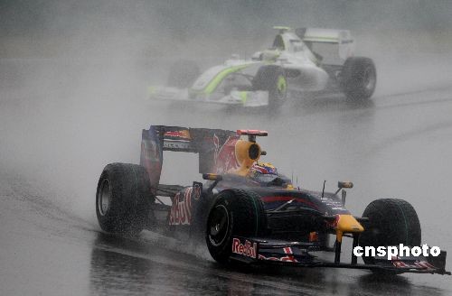 4月19日下午,2009年F1中国大奖赛在上海国际赛车场举行,红牛车队的维特尔在一场雨战中勇夺冠军。中新社发 任晨鸣 摄