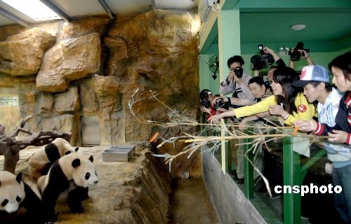 四月二十六日,跳水世界冠军胡佳、羽毛球世界冠军杨维、张洁雯与志愿者们来到广州香江野生动物世界为十只大熊猫做义工。中新社发 刘卫勇 摄