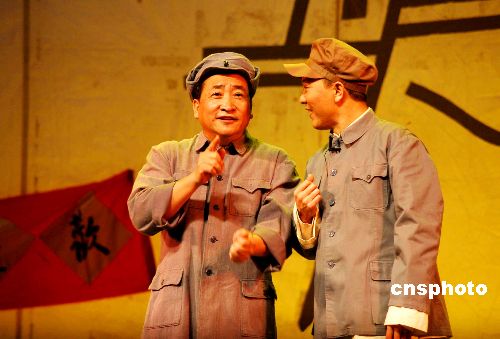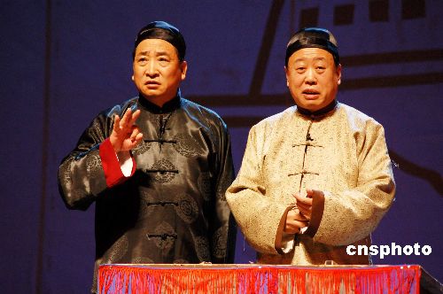 12月10日,姜昆(左)在相声剧《明春曲》演中作精彩表演。由著名相声表演艺术家姜昆领衔主演,汇集赵世忠、李建华、戴志诚等曲艺笑星的相声剧《明春曲》在济南山东会堂上演。精彩的故事、爆笑的段子,让泉城观众领略到相声艺术的百年沧桑和独特的的魅力。据了解,《明春曲》是著名相声表演艺术家姜昆用了10年时间打造并领衔主演的相声剧,是2006年济南国际幽默艺术周的重头戏。中新社发 耿国庆 摄