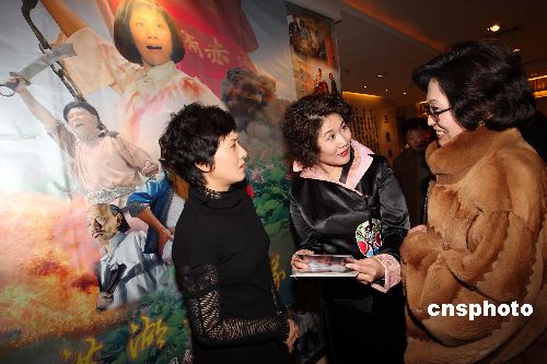 十二月二十六日,歌剧电视剧《洪湖赤卫队》在北京玉龙锦酒店举行新闻发布会暨研讨会。一九六一年搬上银幕的《洪湖赤卫队》成为影响数代人的经典作品,时隔近半世纪后的今天,由湖北省广播电视总台和湖北省歌剧舞剧院联合摄制的中国首部歌剧电视剧《洪湖赤卫队》将与中国广大电视观众见面。图为全国人大代表、梅花奖获得者、剧中主人公韩英的扮演者刘丹丽(左二)、著名影视明星邓婕(左一)与贺龙元帅的小女儿贺黎明在发布会上交谈。中新社发 毛建军 摄