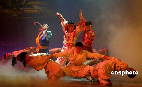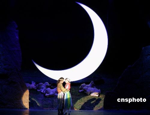 2008年11月7日晚,由宁夏银川艺术剧院创作的中国第一部大型原创回族舞剧《月上贺兰》在福州进行专场慰问演出。舞剧反映了在千百年前的古丝绸之路上,一支来自西域的商队历经艰险,在当地汉族及其他少数民族的帮助下,战胜各种困难,完成了穿越沙漠、东渡黄河的商旅使命。在这一过程中,来自西域的青年纳苏与汉地姑娘海真相互爱慕,产生了真挚的爱情。也正是这种真爱,超越了民族、信仰、习俗的界限,使这一对恋人在贺兰山下结为夫妇,繁衍生息。舞剧以其曲折的剧情、优美的舞姿、豪华的灯光和富有真实感的布景,赢得了观众的高度赞扬。中新社发 汪虎 摄