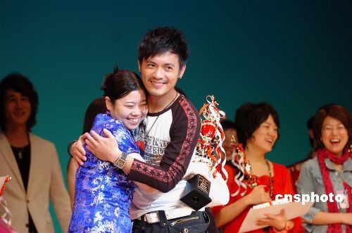 11月17日晚,第11届日中卡拉OK大赛决赛在日本东京练马文化中心举行。这项连续举办了十一年的中国人唱日本歌、日本人唱中国歌的民间歌赛已渐成一知名品牌受到两国文化爱好者的欢迎。因主演了创下台湾票房奇迹的影片《海角七号》而炙手可热的台湾当红小生范逸臣此次作为特邀嘉宾出席大赛,不仅献唱了三首代表作更亲为获得最优秀奖的选手颁奖。图为范逸臣为获奖选手颁奖后与其拥抱祝贺。中新社发 朱沿华 摄