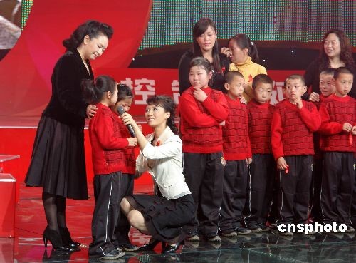 11月15日晚,中央电视台演播厅录制现场,正在进行迎接12月1日世界艾滋病宣传日节目录制。来自山西省临汾市红丝带小学的12名孩子在老师带领下,与预防艾滋病宣传员彭丽媛、濮存昕一起参加节目录制。彭丽媛、濮存昕对这些失去父母的孩子们的真切关爱,让孩子们热泪盈眶。中新社发 王辉耀 摄
