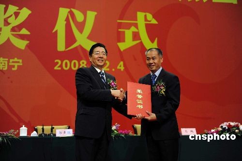 十二月四日,中共广西壮族自治区委员会、广西壮族自治区人民政府授予著名导演张艺谋“广西杰出贡献奖”,奖励一百万元人民币。中新社发 蒋雪林 摄