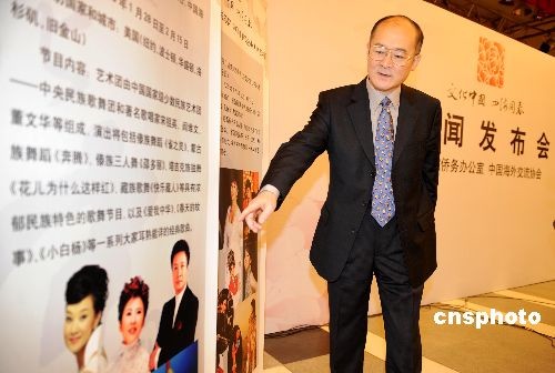12月26日,“文化中国·四海同春”2009年春节文化活动新闻发布会在北京举行,国侨办副主任赵阳向记者介绍春节将在海外为华人演出的艺术家。国务院侨办联合中国海外交流协会将组派4个艺术团和4个艺术小组,分赴北美、南美、西欧、东南亚等国家和地区,以极具中国特色的高质量文艺节目丰富当地华侨华人的春节文化活动。中新社发 廖攀 摄