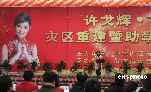 2008年1月6日,由中共四川省内江市委、四川省内江市人民政府主办的“许戈辉灾区重建暨助学募捐活动”在该市东兴区大千广场隆重举行,香港凤凰卫视著名主持人许戈辉现场为“汶川大地震”灾区的贫困学子募集善款,受到当地群众的广泛关注。在活动现场,许戈辉声情并茂地畅谈了自己在地震灾区的见闻,呼吁社会各界都来关注灾区、支援灾区,为更多的贫困学子提供帮助、送去温暖,并带头向灾区捐赠8万元人民币。在许戈辉的带动下,国际狮子总会、好实再集团及内江市的部分企业纷纷上台奉献爱心,共捐出300万元人民币。据了解,这些善款将用于灾区希望小学建设和支持灾区重建。中新社发 兰自涛 摄