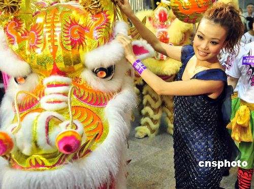 二月二日年初八,香港著名歌星容祖儿担任时代广场“金龙醒狮贺新岁”嘉宾,为六头醒狮点睛及参花挂红。中新社发 谭达明 摄
