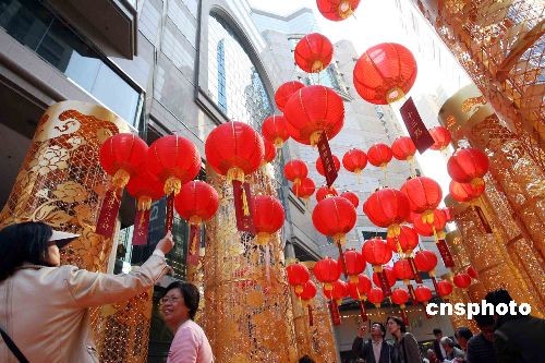 二月四日,农历新年立春,香港时代广场设置元宵街,大红灯笼高高挂,游客在充满节日气氛的场内猜灯谜,迎接元宵佳节。中新社发 洪少葵 摄