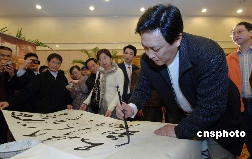 三月二十四日,在电视连续剧《郑和下西洋》中饰演明成祖朱棣的著名演员唐国强在福州举行的该剧开播仪式上现场挥毫题字。该剧是为纪念郑和下西洋600周年特别拍摄的,由福建省委宣传部、中央电视台文艺中心影视部及长乐市委、市政府等单位联合出品。《郑和下西洋》史诗般地描述了郑和率领船队七下西洋,历时二十九年,成功开辟海上丝绸之路的壮举,展现了郑和七次下西洋在政治、经济、文化、外交、科技等领域取得的辉煌成就。中新社发 刘可耕 摄